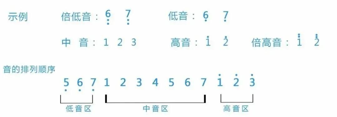 在简谱中,数字下面有两点代表这个音是倍低音,数字下面有一点代表这个音是低音,数字下面没有点那就代表中音,数字上面有一个点代表高音,数字上有两个点代表倍高音。