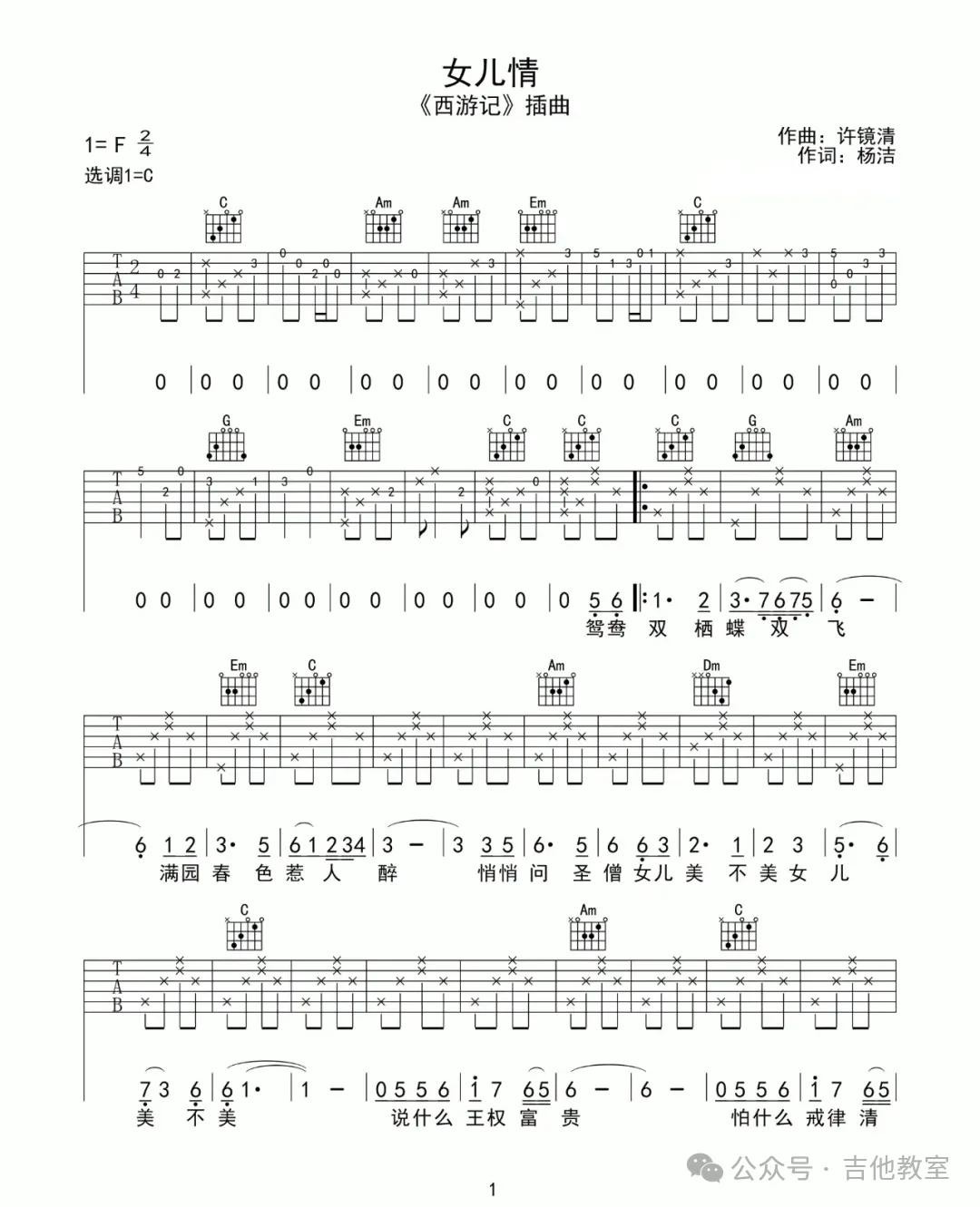 这首歌曲出自经典电视剧《西游记》,和弦简单,旋律优美,适合初学者感受古典韵味。
