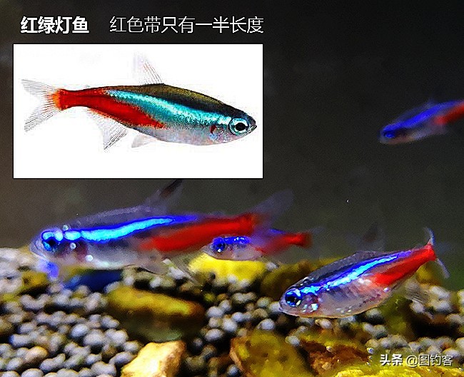 红绿灯鱼学名为霓虹脂鲤,原分布于秘鲁、亚马逊河支流、哥伦比亚、巴西。全身笼罩着青绿色光彩,从头部到尾部有一条明亮的蓝绿色带,体后半部蓝绿色带下方还有一条红色带,腹部蓝白色,红色带和蓝色带贯穿全身,光彩夺目。在不同的光线下或不同的环境中,其色带的颜色时深时浅。红绿灯鱼因体色极为艳丽,有热带鱼中“皇后”的美称,是最受人们喜爱的一种热带鱼品种。体上部的绿线,因光线角度不同,有时显出蓝色,与体下部的红线极为协调。胆小,常在水上安静的环境下游动。喜食活水蚤,极易饲养。