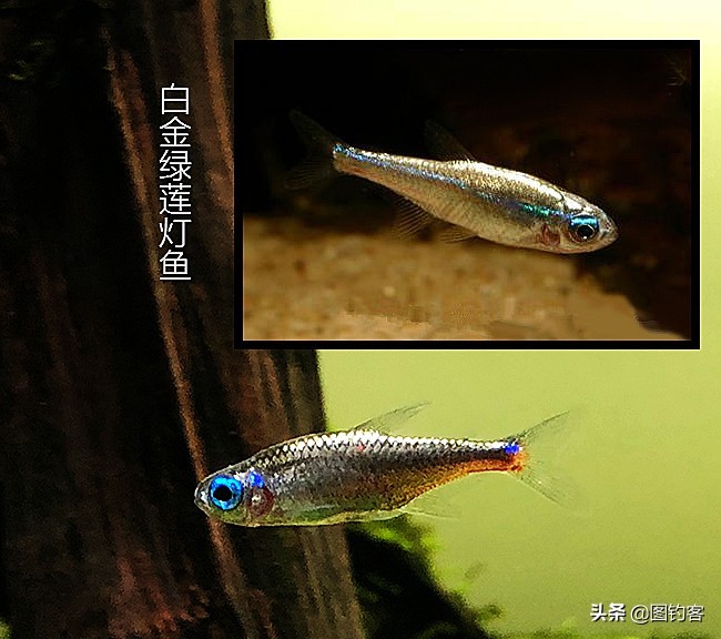 产自拉丁美洲巴西境内的尼格罗河流域上游与奥里诺科河流域一带。绿莲灯鱼的身形与红绿灯鱼基本相似,但不同的是红绿灯鱼从头至尾由一条蓝绿色带贯穿,而绿莲灯鱼则基本由一条蓝色带贯穿。在色带的下方,红绿灯鱼有一抹极为引人注目的鲜红色,绿莲灯鱼却没有。这使得它的绿色更加显眼,绿莲灯鱼正是由此得名。绿莲灯鱼还有一个种类叫白金绿莲灯鱼。