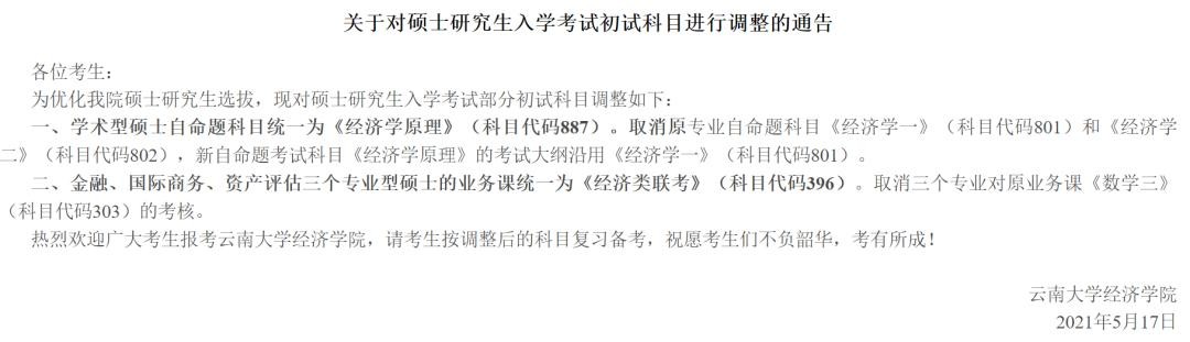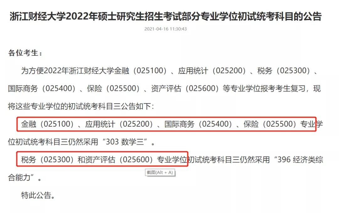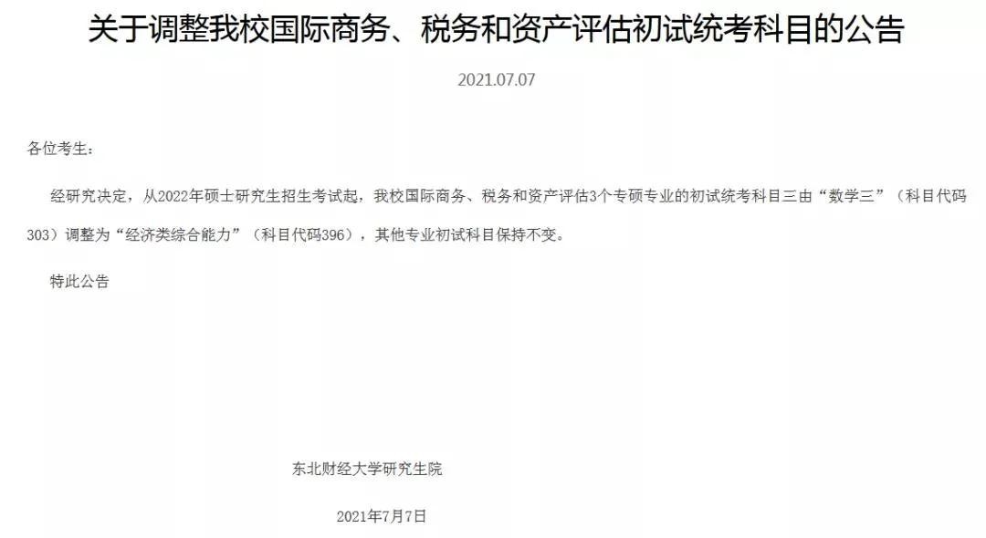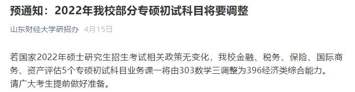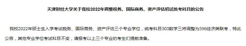 税务、国际商务、资产评估三个专业学位,统考科目303数学三将调整为396经济类联考。