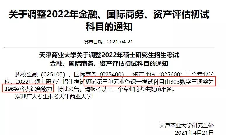 金融、税务、国际商务专业学位研究生考试初试科目数学三(科目代码303)调整为经济类综合能力(科目代码396)。