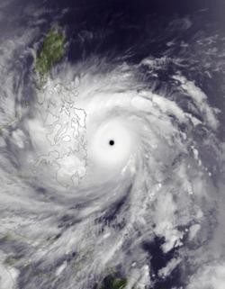 2013年台风海燕,发生于东南亚的菲律宾,强风半径达500千米,最高风速在230 km/h至315 km/h之间,造成6340人死亡、1880人失踪、逾30000人受伤。