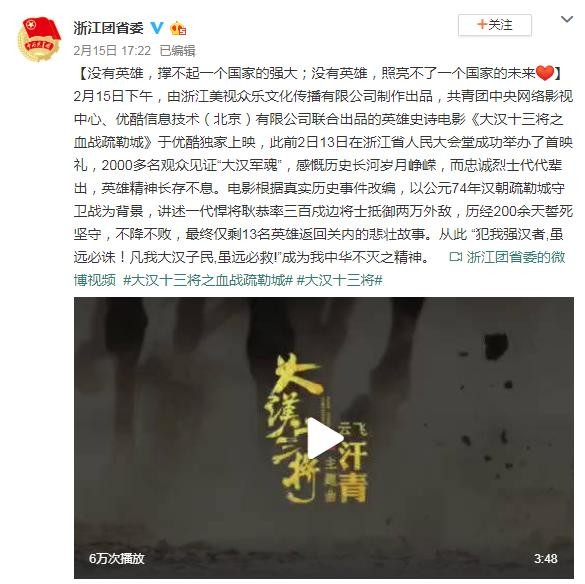 “壮志饥餐胡虏肉,笑谈渴饮匈奴血”,岳飞诗词中描述大汉将士英勇对抗匈奴,就是电影《大汉十三将之血战疏勒城》讲的故事。2月15日,这部由优酷、共青团中央网络影视中心等联合出品、在优酷平台独家播映的英雄史诗电影,开启了网络电影的正能量时代。电影中表现的历史英雄情怀,获得共青团浙江省委点赞:“没有英雄,撑不起一个国家的强大,没有英雄,照亮不了一个国家的未来。”