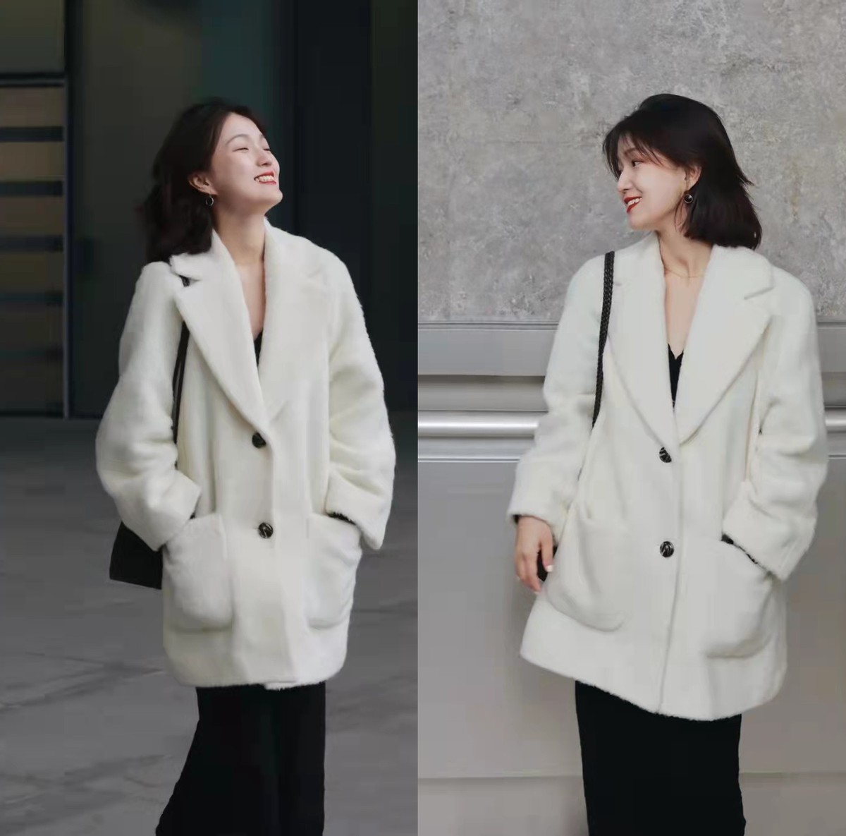 比如这件中长款的大衣,摇粒绒材质可以让肌肤感觉到满满的暖意,而搭配黑色裙装,则使深浅色调形成了互补,简约却不失大气。