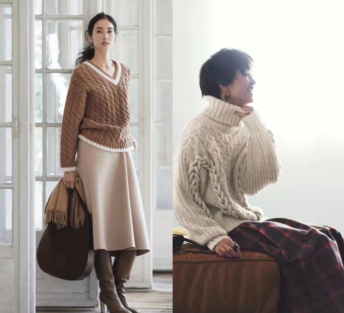 虽然搭配的都是同样的服装,但也因为一些设计的不同,呈现出不同的风格。比如白色的扭花毛衣是高领的样式,可以使穿搭看上去更加柔和淡雅,而格子半身裙的加入,又多了更多的时尚感。