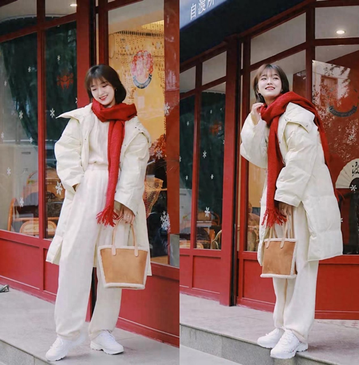 比如这一身全白色的服装,中性色的简单,加上没有色彩的过渡与对比,就很容易让造型看上去没什么特点。而这时加入一条红色的围巾,就适当地点缀出了温暖的气息,看上去亮眼了不少。