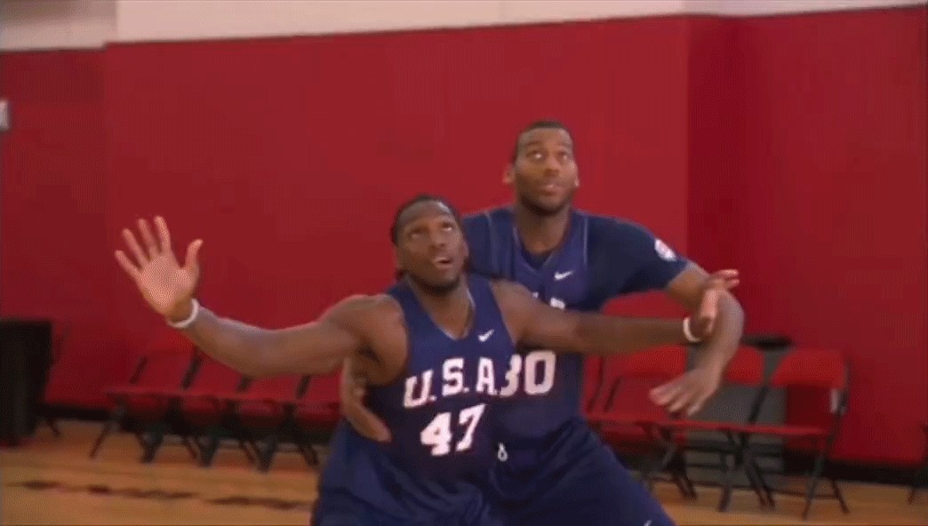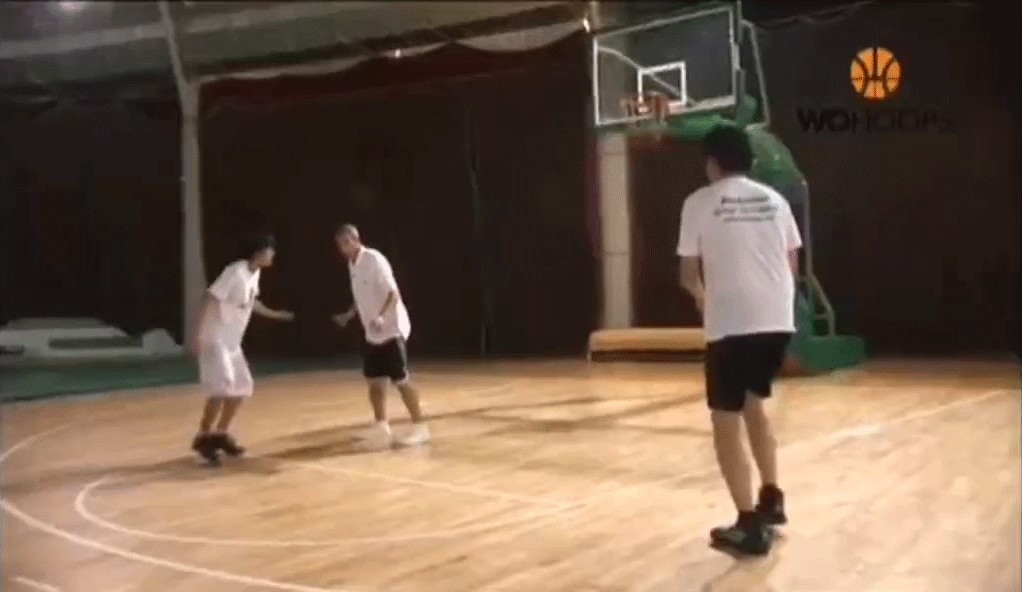 先不讨论这个球是否犯规,我们看看黑色队员的抢篮板技术。从这个视频中可以看出来,主动对抗进攻人的重要性。在比赛中,积极的进攻人会从外线跑进来冲抢篮板。这时候内线防守球员应该要主动去寻找对抗,把防守人挡在身后。这个练习,就是模拟这种情形。