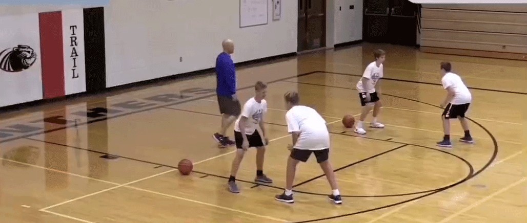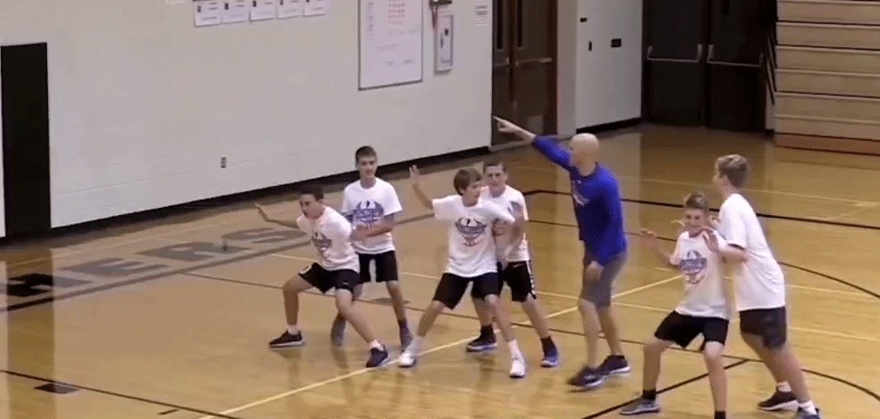 我们看看图片中的黄色34号队员。 当投篮出手时,他迅速转身卡位把对手背在身后。虽然他没有抢到篮板,但是在他的帮助下,队友拿到了篮板。我们接下来做的一个练习就是针对这种卡位进行的练习。