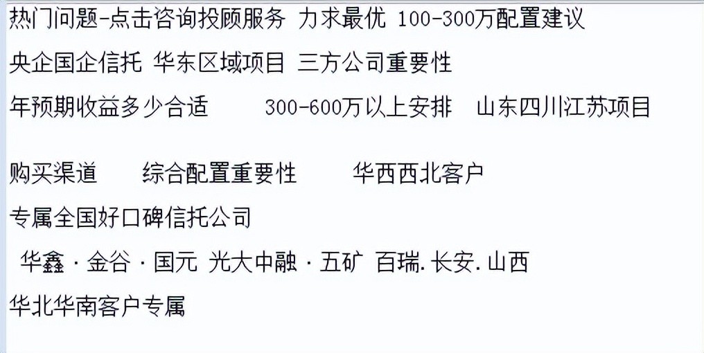 投资者了解信托相关概念后,也会接触到具体的信托产品。信托产品一般1-3年期期限比较常见,多数以2年期为主;投资门槛100-300万起,也有具体小点的30-50万起的,不过以前者中高点的资金为主。固定收益类的政信基建类产品收益在6.5-7.5%/年之间,其它地产、工商企业类收益会高一些,不过风险也会有所增大。所以保守防御性基建政信类比较受到市场投资者欢迎。