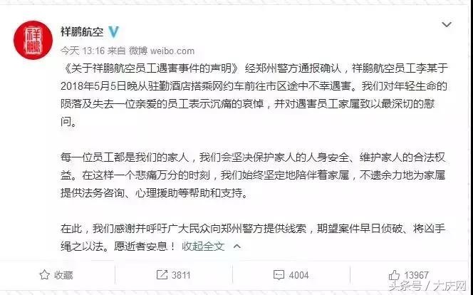 据河南媒体报道,5月6日,遇害空姐在郑州市航空港区搭乘一辆轿车赶往市内时遇害。报道称,民警告诉遇害者家属,嫌犯是一名滴滴司机,身上携凶器,作案后潜逃。