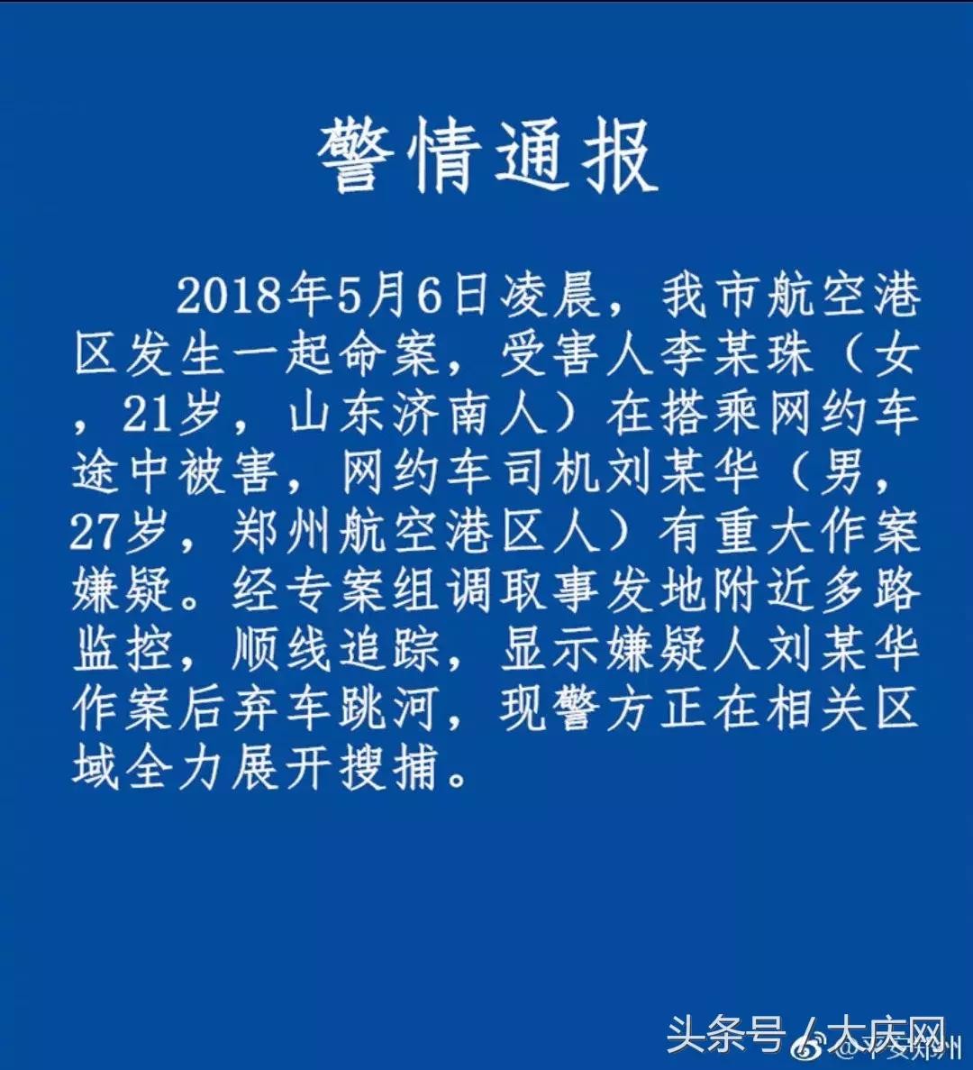 5月10日晚间,郑州警方通报“空姐乘顺风车遇害事件”称,5月6日凌晨,21岁的李某珠在搭乘网约车途中被害,司机刘某华(男,27岁,郑州航空港区人)有重大作案嫌疑。经专案组调取事发地附近多路监控,顺线追踪,显示嫌疑人作案后弃车跳河,现警方正在相关区域全力搜捕。