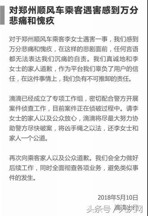滴滴公司发布通报称,对郑州顺风车乘客李女士遇害一事,感到万分悲痛和愧疚,“真诚地和李女士的家人道歉,作为平台我们辜负了用户的信任,在这件事情上,我们负有不可推卸的责任。 ”