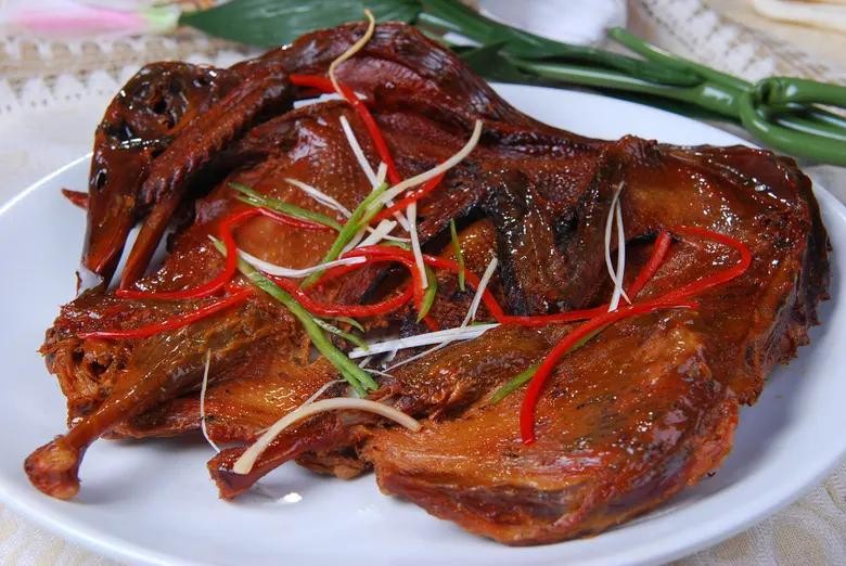 湖南酱板鸭是一道湖南常德的特色名菜。选材为本地特有的水鸭,是经三十多种名贵中药浸泡,10余种香料、经过风干、烤制等15道工序精制而成,成品色泽深红,皮肉酥香,酱香浓郁,滋味悠长。酱板鸭的味道好有嚼劲,越吃越有味道,好吃得停不下来,味道让你回味无穷。