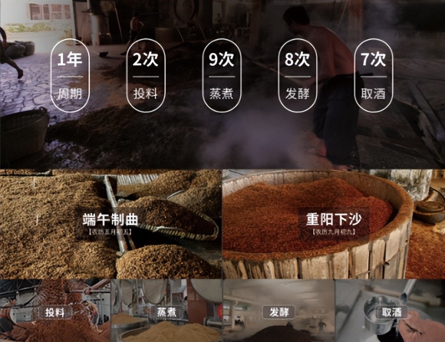 优级的酱香型白酒采用的是传统的“12987”大曲坤沙酿造工作,其酿造周期长达1年之久,在这1年内需要进行2次投料、9次蒸煮、8次发酵、7次取酒;上百道制作工序,酿造完成之后,还会根据品级窖藏3-5年甚至更久,再由专业调酒大师进行老酒勾调,然后才能出厂。