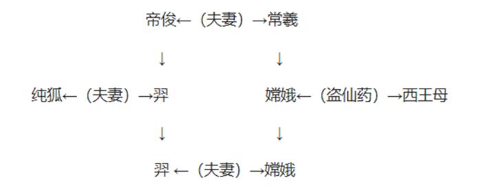 西汉初年所成之书《淮南子》,是史上第一次将嫦娥与羿放在一起谈论的书籍,但是,尽管如此,仍然未明确指出两人的夫妻关系。一直到了东汉时期,在高诱所注的《淮南子》中,才明确的写道:“嫦娥,羿之妻”。因此,为了明确阐述两者之间的关系,笔者找到了这样的一张图: