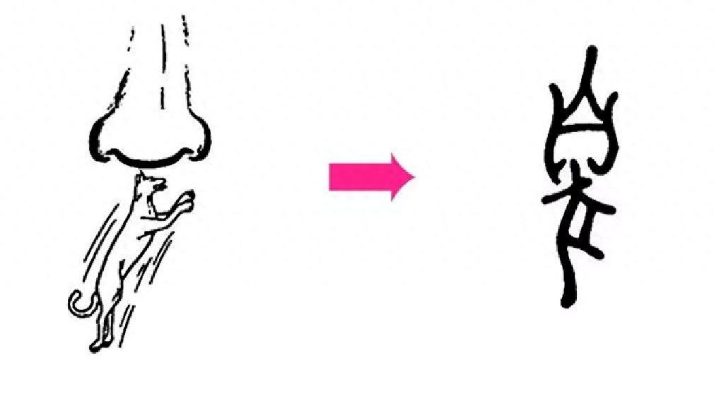 由于表示鼻子意思的“自”字,演化为用来表示“自己”的意思,那就只好再造一个“鼻”字来表示鼻子。鼻字是形声字,上面的“自”为形旁表形,下在的“畀”声旁表音。从文献上来说,鼻字开始见之于战国时期。