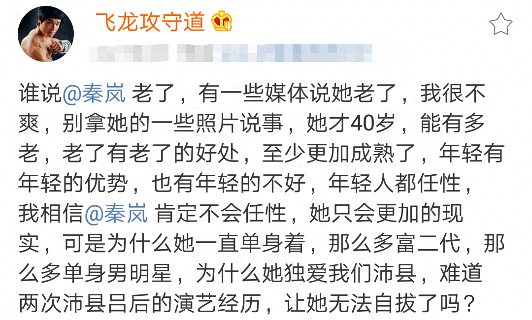 近日,33岁的沛县功夫新星“现代李小龙”飞龙继续对自己的梦中情人秦岚隔空示爱,飞龙此前曾多次强调,秦岚和江疏影是自己未来妻子的第一、第二人选,有时候飞龙看到秦岚和别的男演员、男导演勾肩搭背,他会乱发脾气,并把江疏影视为未来妻子第一人选,将秦岚推到第二位,不过当飞龙看到有人说秦岚的坏话时,他又特别不爽。