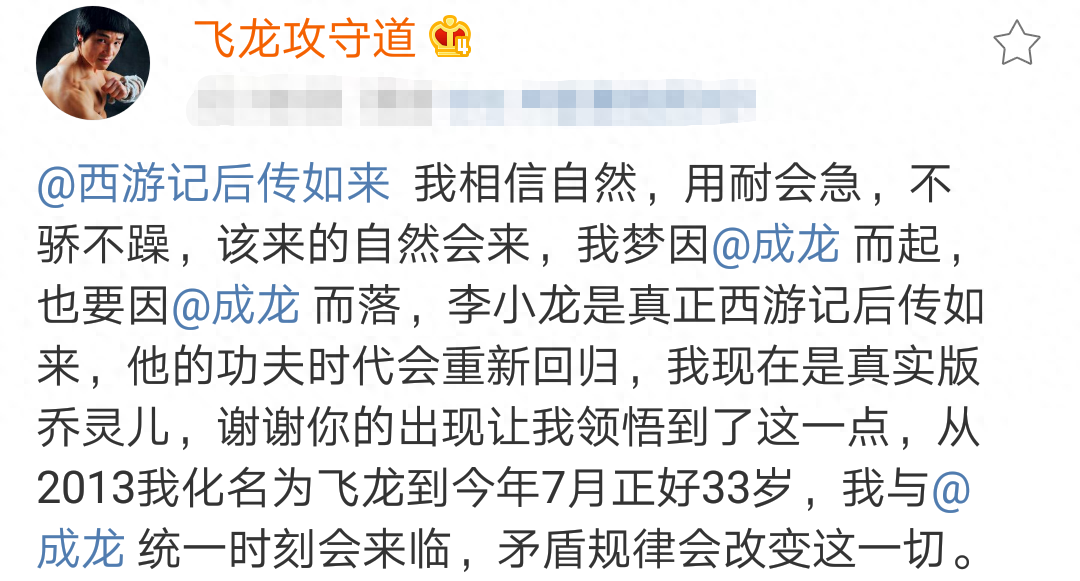 随即,飞龙又提到了自己的使命:“西游记后传如来,我相信自然,用耐会急,不骄不躁,该来的自然会来,我梦因成龙而起,也要因成龙而落,李小龙是真正西游记后传如来,他的功夫时代会重新回归,我现在是真实版乔灵儿,谢谢你的出现让我领悟到了这一点,从2013我化名为飞龙到今年7月正好33岁,我与成龙统一时刻会来临,矛盾规律会改变这一切。”
