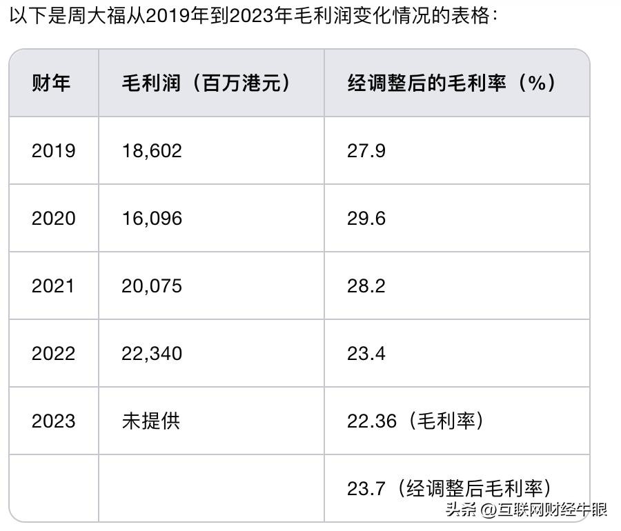 周大福:2023财年的毛利率为22.36%,创下了近9年来的新低。