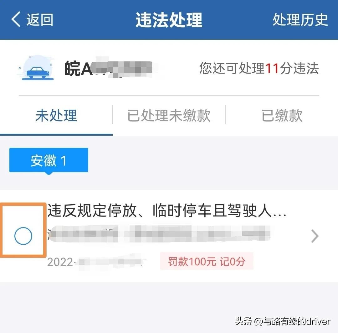 然后,点击“处理”模块,进入“未处理”列表,勾选需要处理的交通违法前面的圆圈。
