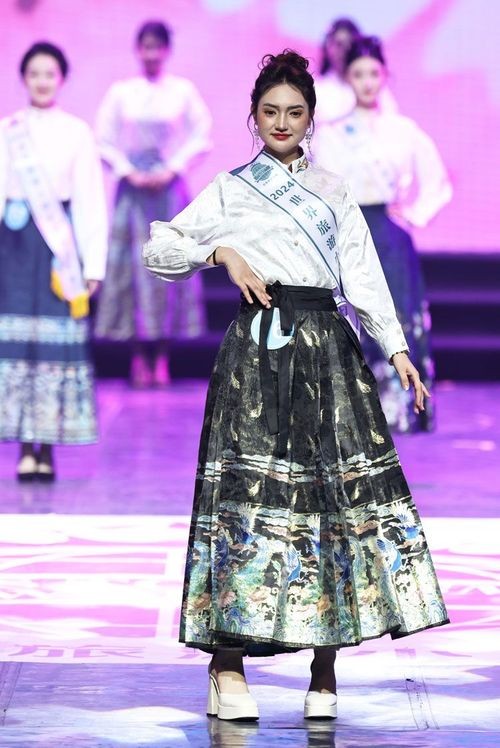 图尔荪阿依·热合曼在马面裙展示环节。中青在线记者刘占崑摄