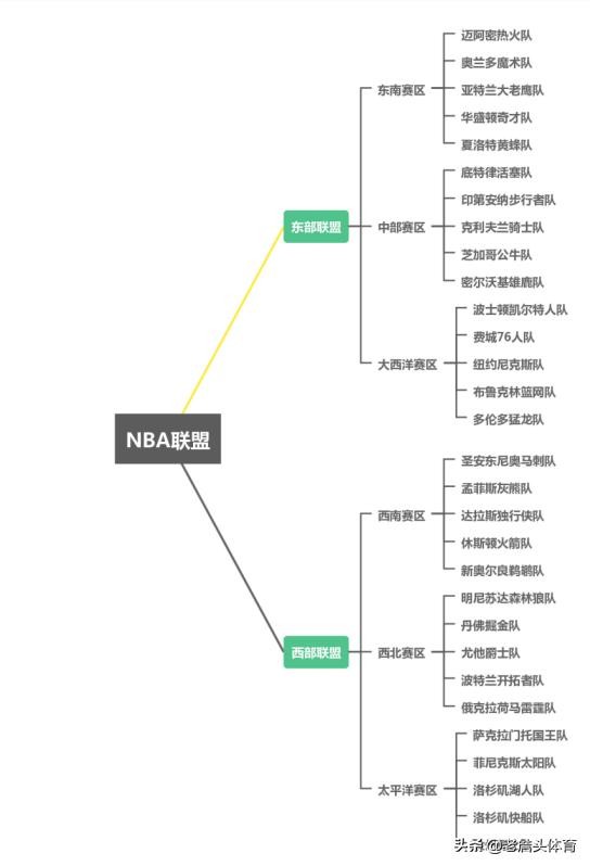 NBA发展至今已经有七十多年的历史了,目前联盟里面共有30支球队,主要是按照美国各个州进行球队分布的,同时NBA联盟又分为东部和西部;东部和西部各15支球队,一共30支球队。每个地区都有一个或多个球队。分完东西部之后又把这些球队按照地理位置划分成了六大赛区,分别是:太平洋赛区、西北赛区、西南赛区、东南赛区、中部赛区和大西洋赛区。每个赛区5支球队。所属球队中除了一支来自加拿大的多伦多之外,其余均位于美国。
