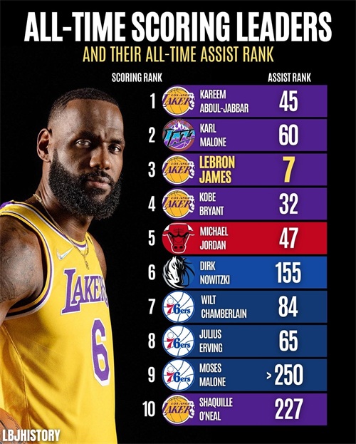 但是詹姆斯恰恰就是既能得分,也能助攻的典型代表,所以他成为了历史总得分前十球员中助攻最多的,历史总助攻前十球员中总得分最多的。除了詹姆斯,总得分历史前十中助攻最多的是科比,但科比只排在助攻榜第32位。而除了詹姆斯,总助攻历史前十中得分最高的罗伯特森,排在历史第十五位。