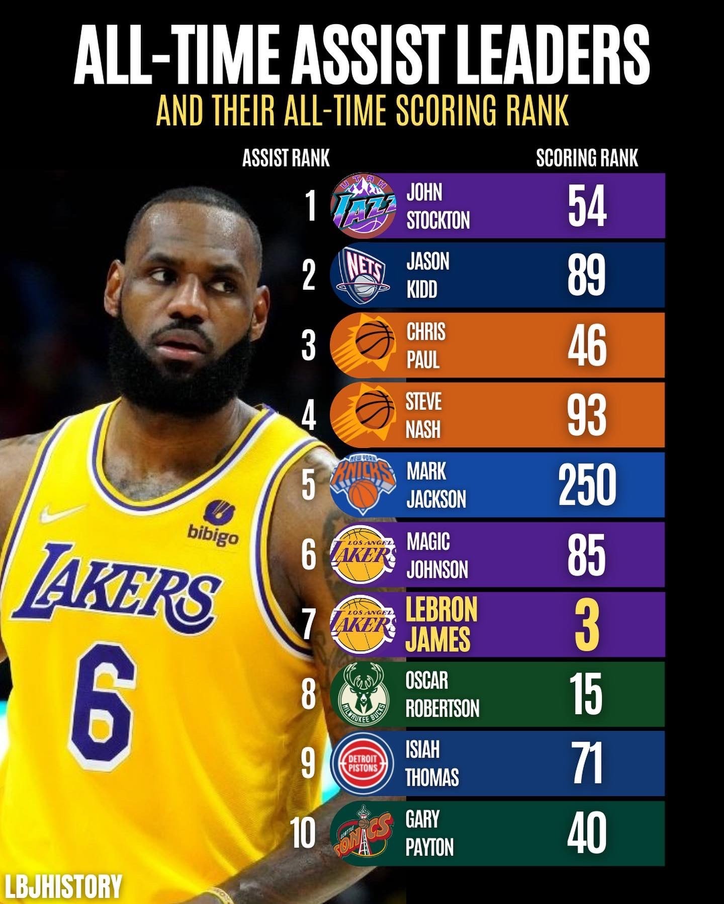 历史唯一!历史得分前十詹姆斯助攻第一,助攻前十詹姆斯得分第一