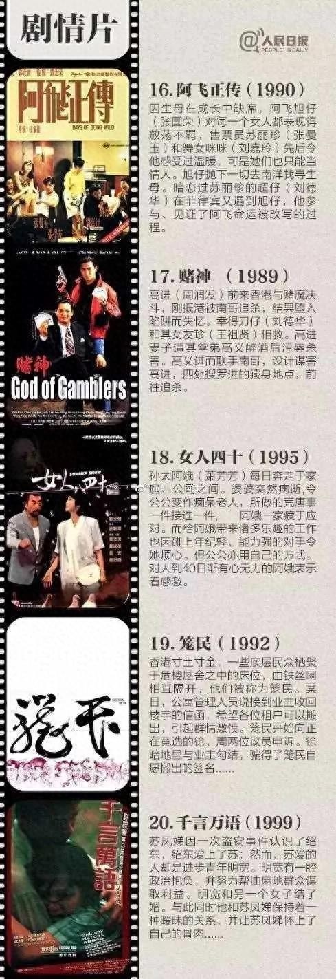 剧情片,不同于动作片的精彩打斗,爱情片的缠绵,喜剧片的搞笑。它的节奏往往比较慢,但是情节却十分紧凑,往往描述的是一种社会现象和一定人群的生活状态,容易使观影者产生情感上的共鸣。不过,在观影者内心日益浮躁的今天,真正能耐下心来看完一部剧情片的人相对较少,但这并不妨碍剧情片在所有片种里较高的艺术价值。本期小帅带大家一起看下人民日报评选的五部香港剧情片是哪些:其中张国荣、周润发的代表作上榜。