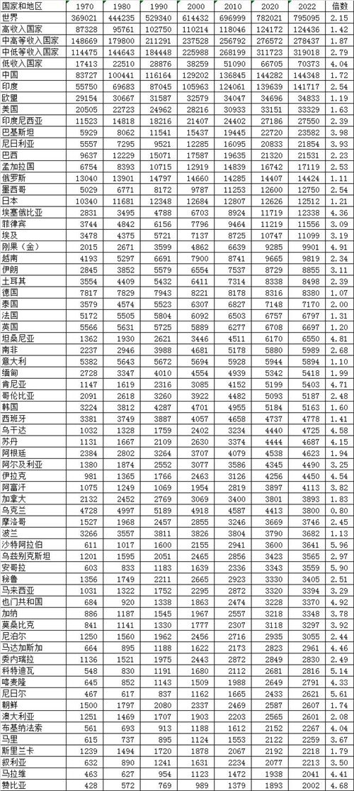 1970年人口上亿的国家只有中印美苏和印尼5个国家,2022年上升到14个国家。我国人口从1970年的8.4亿增加到14.4亿,增长了72%,继续保持世界第一;印度人口从1970年的5.6亿增加到2022年14.2亿,增长了154%。14个人口大国中埃塞俄比亚增长最快,2022年人口是1970年的4.4倍;其次是巴基斯坦,2022年人口是1970年的4倍;其他国家相继是尼日利亚3.9倍、埃及3.2倍、菲律宾3.1倍。俄罗斯和日本人口增长最慢,50年只增长了11%和21%,第三人口大国美国增长了63%。