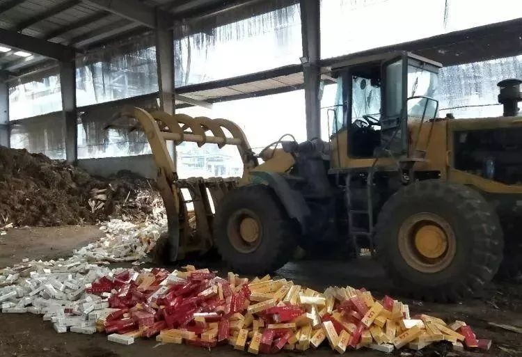 下午3点,执法人员把两车假冒卷烟分批卸下,然后堆积如山的假冒卷烟在几台铲车的铲运下,被送上粉碎机被粉碎殆尽。