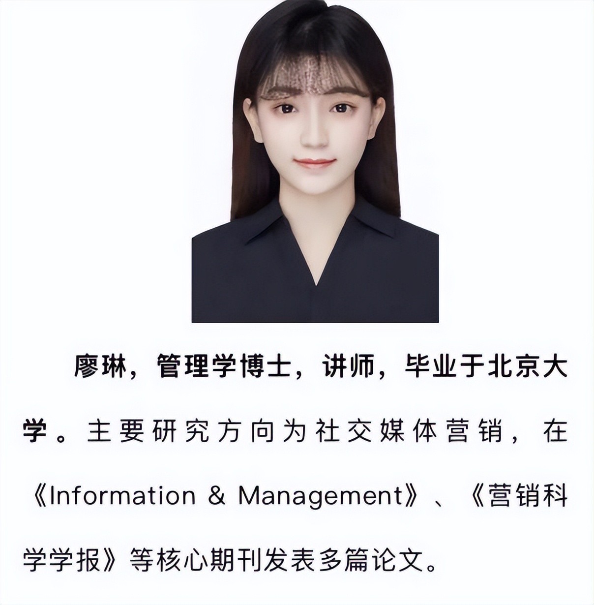 这位老师名字叫廖琳,是95后,她在南方出生,长着一张娃娃脸。廖琳穿着打扮非常时尚,和大一新生没有什么区别,不过她的实力却不容小觑,她是管理学博士,目前是北大22届数字化营销班的班主任。