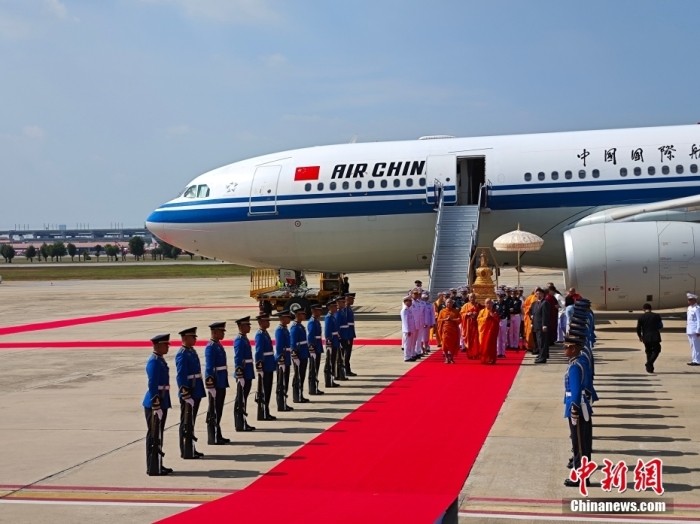 当地时间4日中午,佛牙舍利抵达泰国曼谷廊曼机场,中国国家宗教事务局局长陈瑞峰、中国驻泰国大使韩志强,泰国副总理素里亚、外交部长玛里以及中泰两国高僧等共同出席迎接仪式。