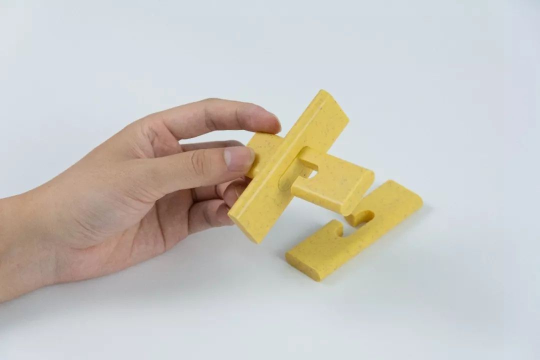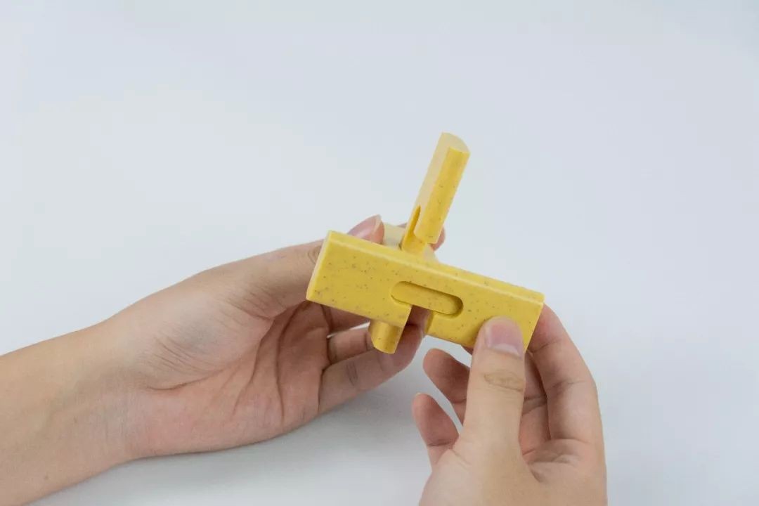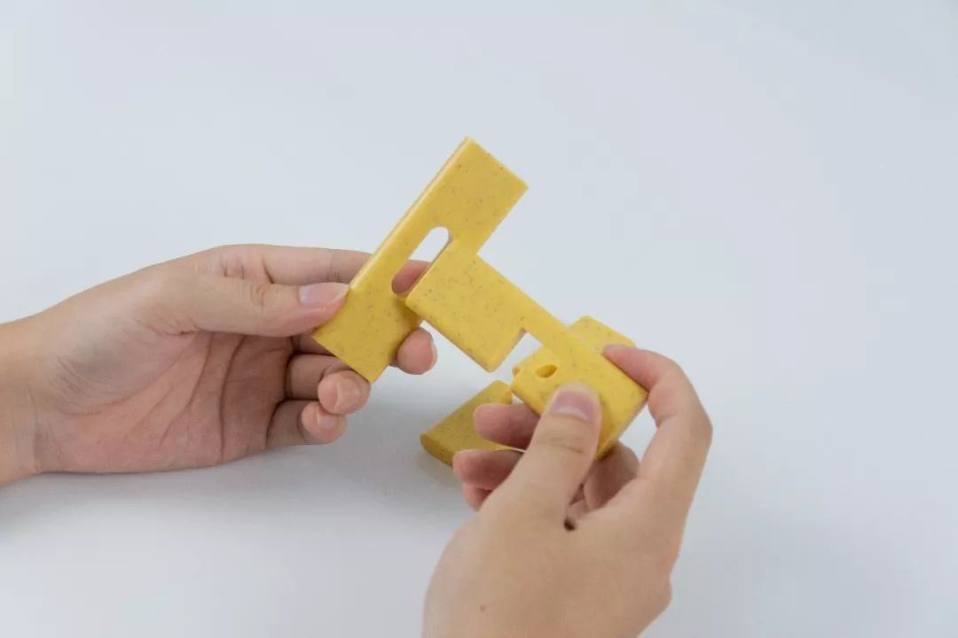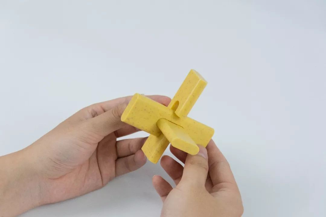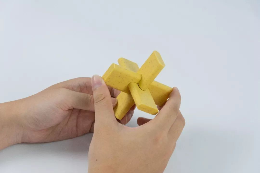 左手拿起带孔的孔明锁,右手拿起与右手相同的孔明锁,往里插入