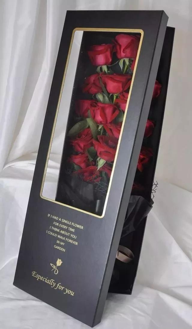 礼盒花束即以盒装的形式包装出的花束,其实就是在花束的基础上加一个盒装的包装,通常盒子是长条形的,有的还有透明的窗口状塑料片,能让人在花束放入后依然能看到局部。