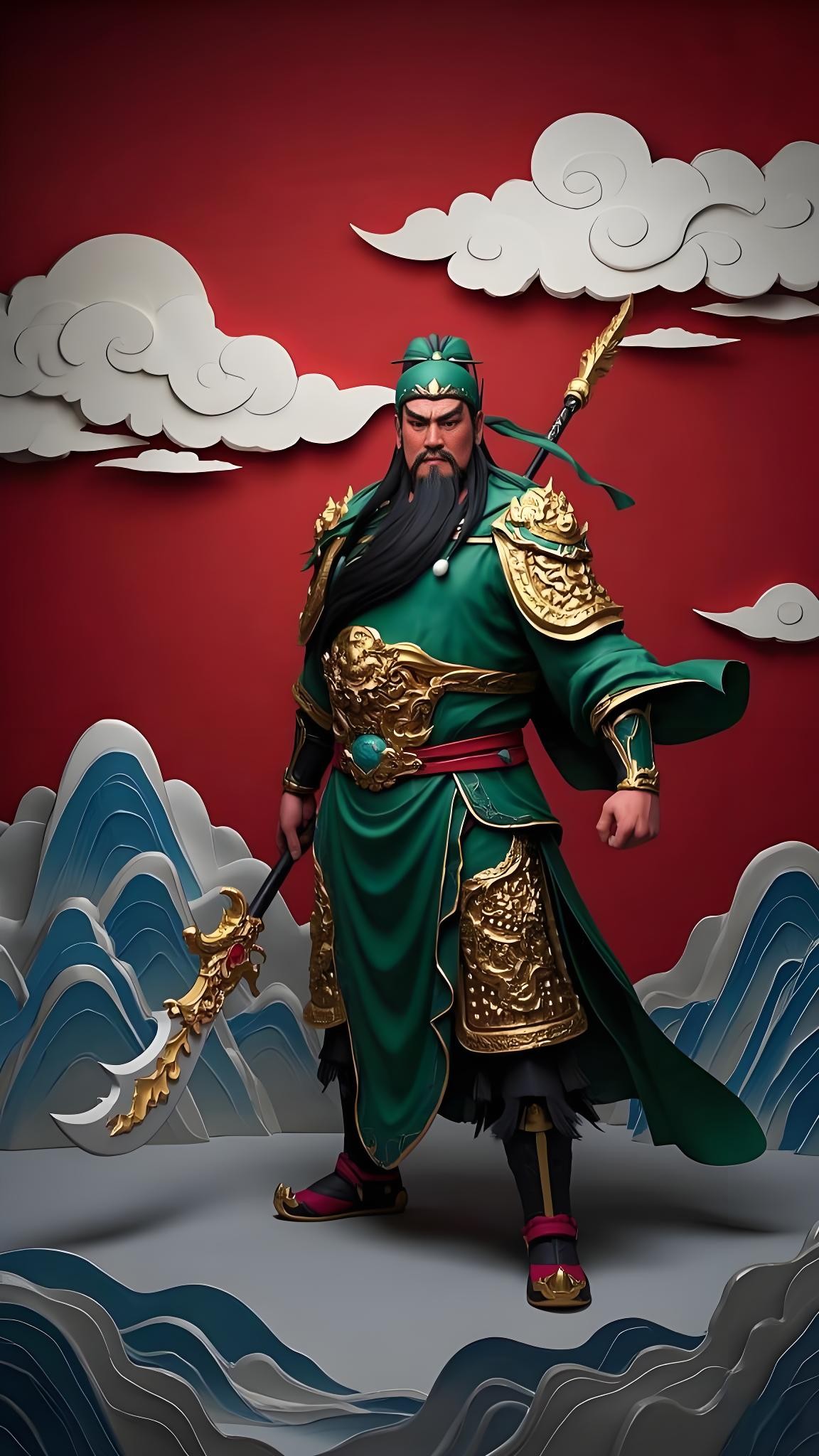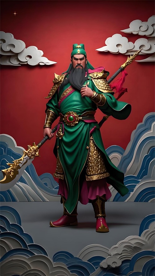 关公目光如炬,直视前方,眼神中满是不容侵犯的威严;左手悠然捋须,尽显沉稳儒雅,右手则有力地握持着青龙偃月刀,刀锋向下,好似能将世间一切邪祟罪恶斩于刀下。
