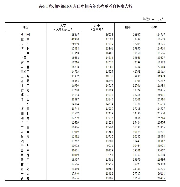 4、在受教育方面,每10万人口中拥有大学(大专及以上)教育程度的为11897人,高中(含中专)教育程度的为15145人,初中教育程度为35501人,小学教育程度为27514人。