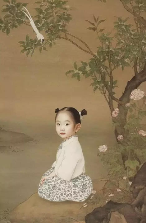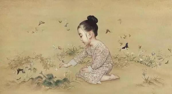 这幅画描述的是女儿在自己工作室伸手拿假花的状态,看上去非常灵动,惟妙惟肖,在他画的女儿里,都加上了特殊的元素,比如山水,花鸟虫鱼等一些古典的东西,据画家自己讲,他希望自己的女儿可以成为画里的小仙女。