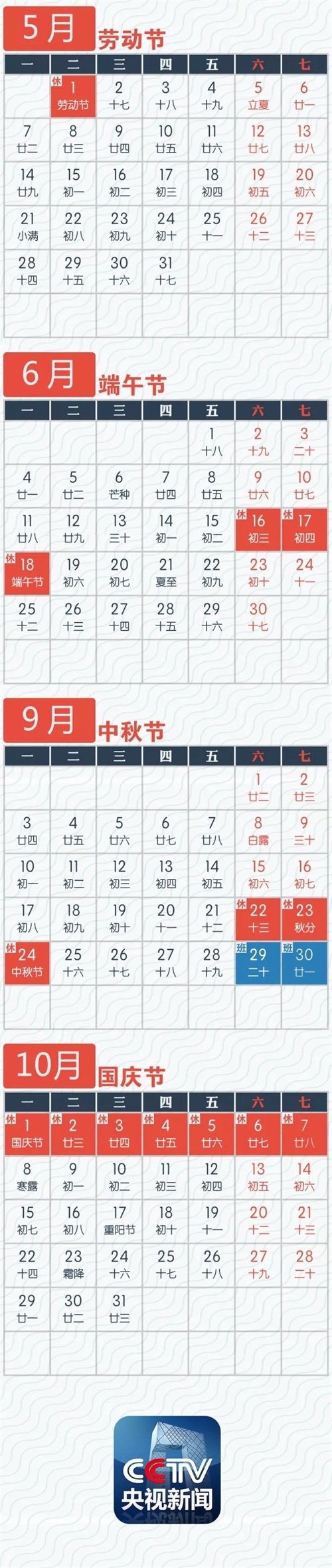 六、中秋节:9月24日放假,与周末连休。