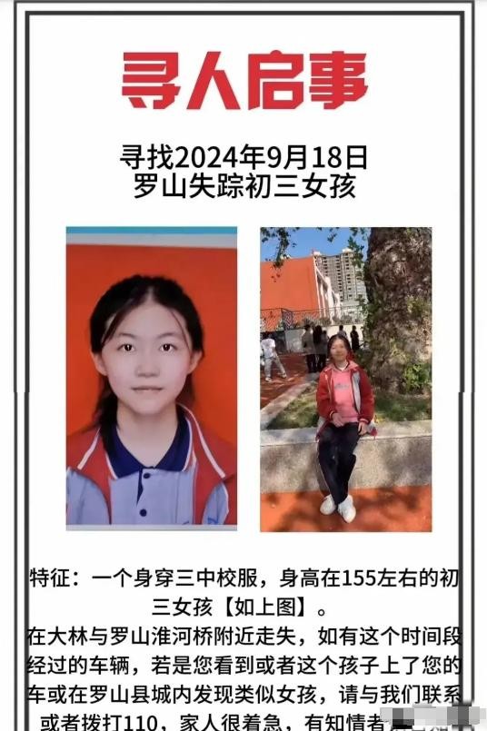 9月18日早上,一个初三的女孩在河南驻马店正阳县失联了,这件事发生在她爷爷送她去河南信阳罗山县上学的路上。女孩的爷爷,涂先生,说他们是骑电动车去的,但在半路上,孙女就不见了。家里人现在还是一点消息都没有。
