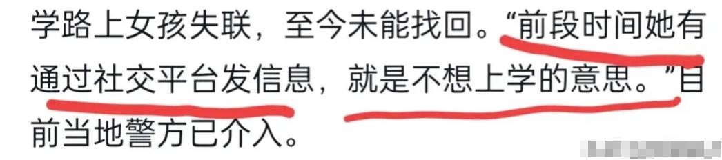 前不久,女孩还在社交平台上发过信息,说她不想上学。这让家人更加担心,不知道她是不是因为这个原因做出了什么决定。目前,当地警方已经开始介入调查这件事。