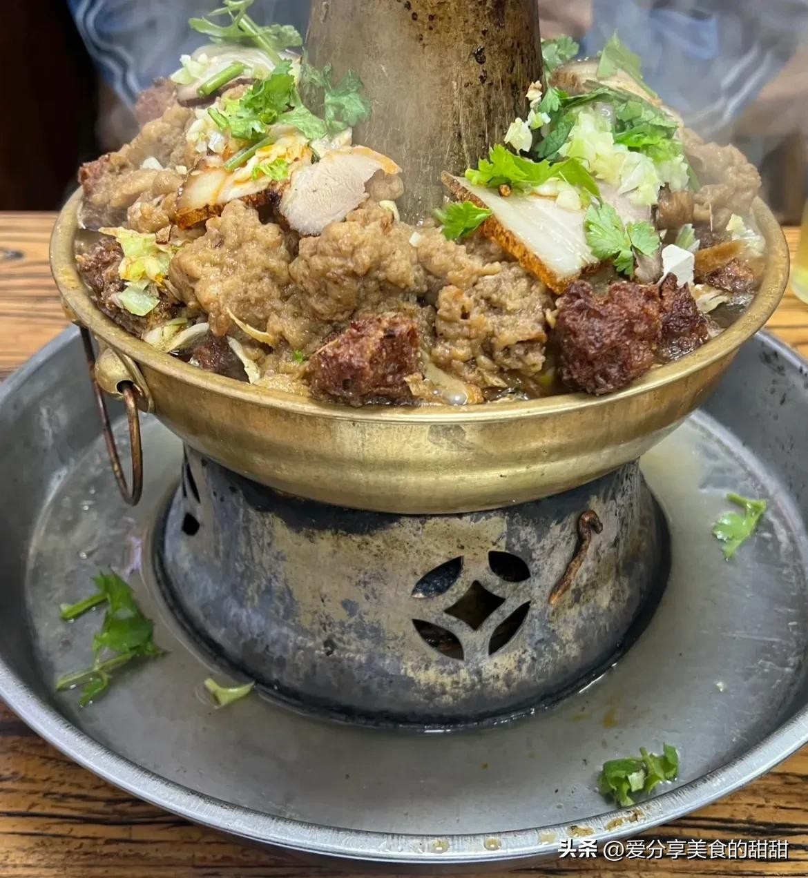 铜火锅可以说是新绛的一个特产了~上面一层肥肉、一层瘦肉、一层小酥肉、一层排骨、一层肉丸子、一层素丸子、一层豆腐、一层粉条、一层白菜,然后会有家里自己煮的生汤,一点一点煮..吃铜火锅少不了烤馍,把大馒头切块后往上蹿的小火焰处,来回的晃动两下就酥了。
