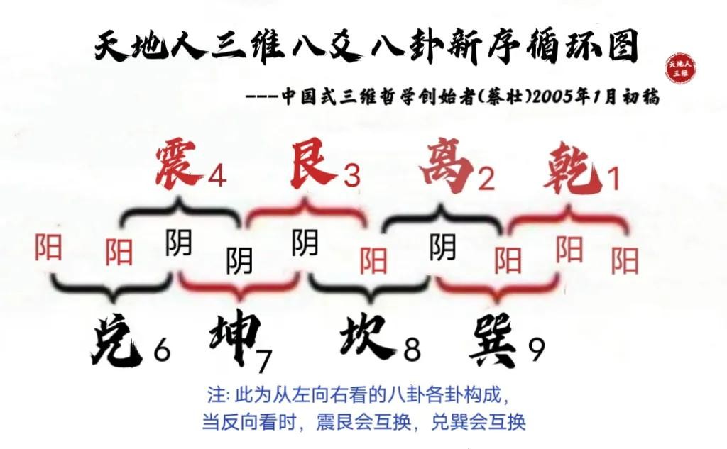 这张图呈现的是平面展开式的八爻八卦新序循环图。它基于八个独特标识构建,这些标识里有三个阳爻、三个阴爻,还有一组是一个阳爻与一个阴爻的组合。位于中间的标识,会分别与左右两侧的标识相互聚合,通过这样的方式联合形成卦象。在经过三次这样的联结后,上方依次生成乾、艮、震、离四卦,下方则产生巽、坤、坎、兑四卦。由此可见,利用这八个标识(也就是八爻)就能构建出八卦。与传统方法不同,这里不需要借助24爻来组合成八卦图。