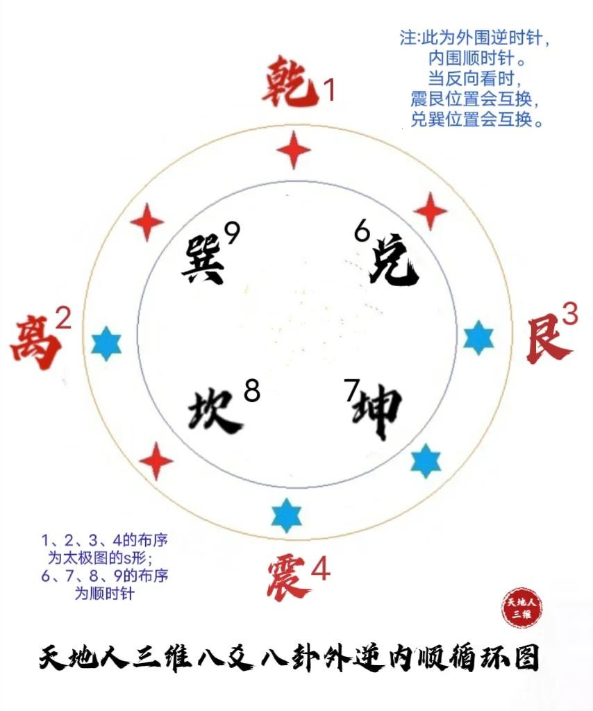 上图是根据“天地人三维八爻八卦新序循环图”精心绘制而成。在图中,以红星象征阳,蓝雪花代表阴。其外部的1、2、3、4 布序方式恰如太极图的S形;而内围的6、7、8、9 则遵循纯顺时针方向进行布序。