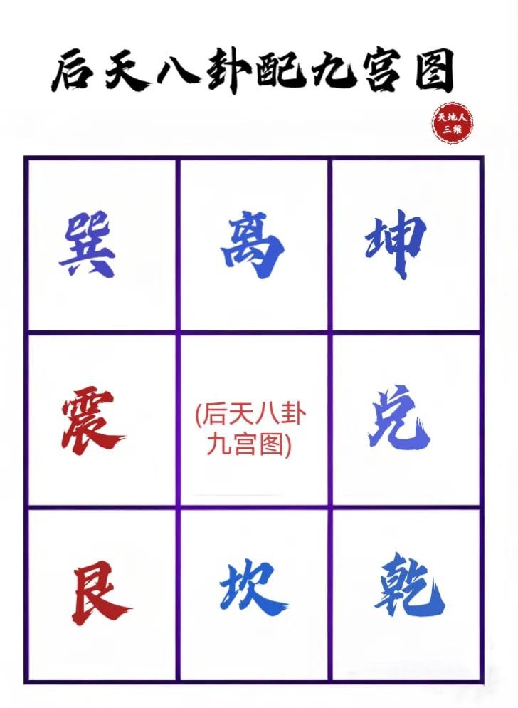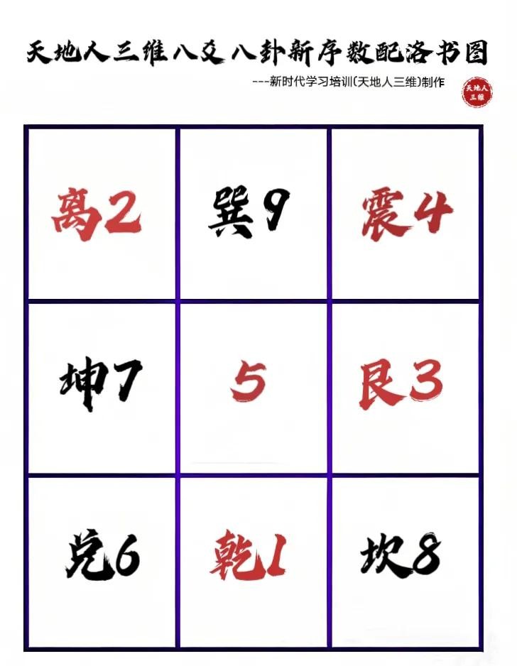 天地人三维八爻八卦新序数配洛书图,巧合并完美地重现了后天八卦图的布局