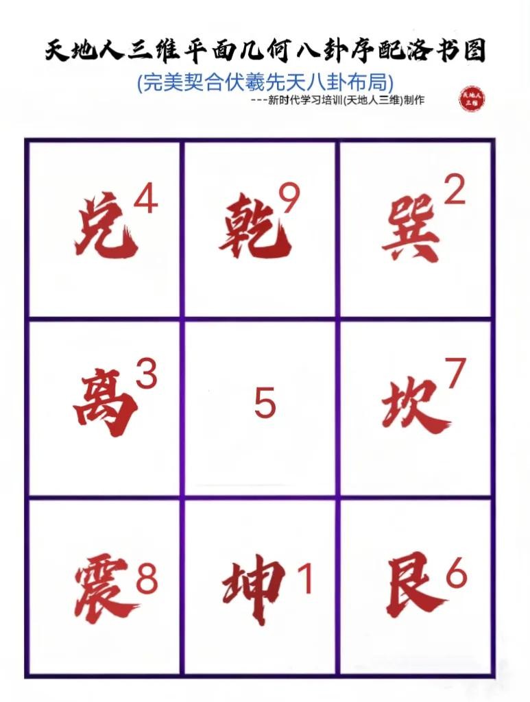 这幅图展示的是 “天地人三维八卦几何图” 的序数与洛书的对应关系,二者的组合与伏羲先天八卦图的布局达到了完美契合。