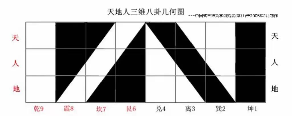 这幅“天地人三维八卦几何图”由24个小方格构成。整个图形横向以天、人、地为依据划分成三行,纵向来看,每一列的三个小方格分别对应着八卦中的一卦 。通过这种布局,八卦之间的阴阳呼应、阴阳消长关系清晰直观地展现出来,淋漓尽致地体现了卦象所蕴含的和谐统一与阴阳平衡的理念。同时,该图还将卦象组合的奇妙之处与几何图形的美感完美融合,呈现出别具一格的魅力。
