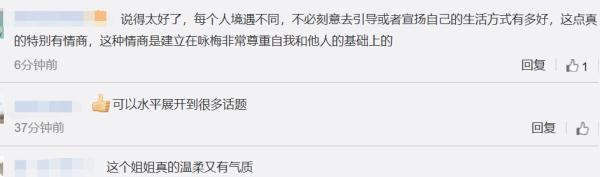 咏梅的这一番话也得到了很多人的理解与称赞,情商也很高,每个人都有自己的生活方式,不必刻意去引导或者宣扬自己的好,尊重自己也尊重别人。