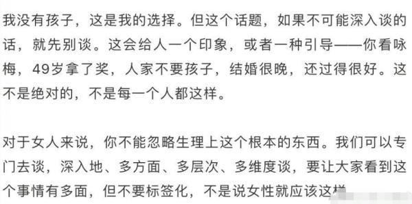 但是孩子这个话题如果不可能深入谈的话那就先别谈了,这会给人一个印象或者是一种不好的引导,你看咏梅49岁拿了奖,人家不要孩子,结婚也很晚,但是却过得很好,但是这不是绝对的,并不是每个人都是这样的。